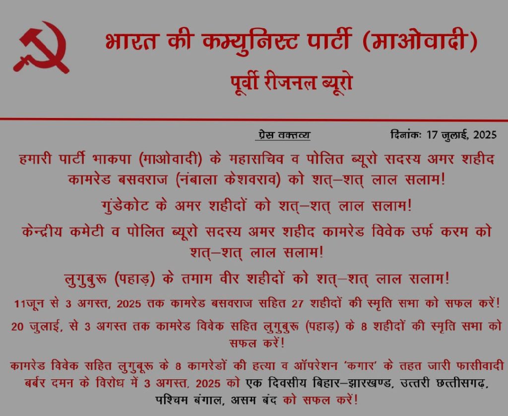 गिरिडीह/रांची: झारखंड और बिहार समेत पांच राज्यों में एक बार फिर नक्सली बंद का ऐलान किया गया है। प्रतिबंधित संगठन भारतीय कम्युनिस्ट पार्टी (माओवादी) ने 3 अगस्त 2025 को झारखंड, बिहार, उत्तरी छत्तीसगढ़, पश्चिम बंगाल और असम में बंद का आह्वान किया है। बंद का उद्देश्य नक्सल ऑपरेशनों और लगातार हो रही मुठभेड़ों के विरोध में “जनविरोधी कार्रवाइयों” के खिलाफ अपनी नाराजगी जाहिर करना है।